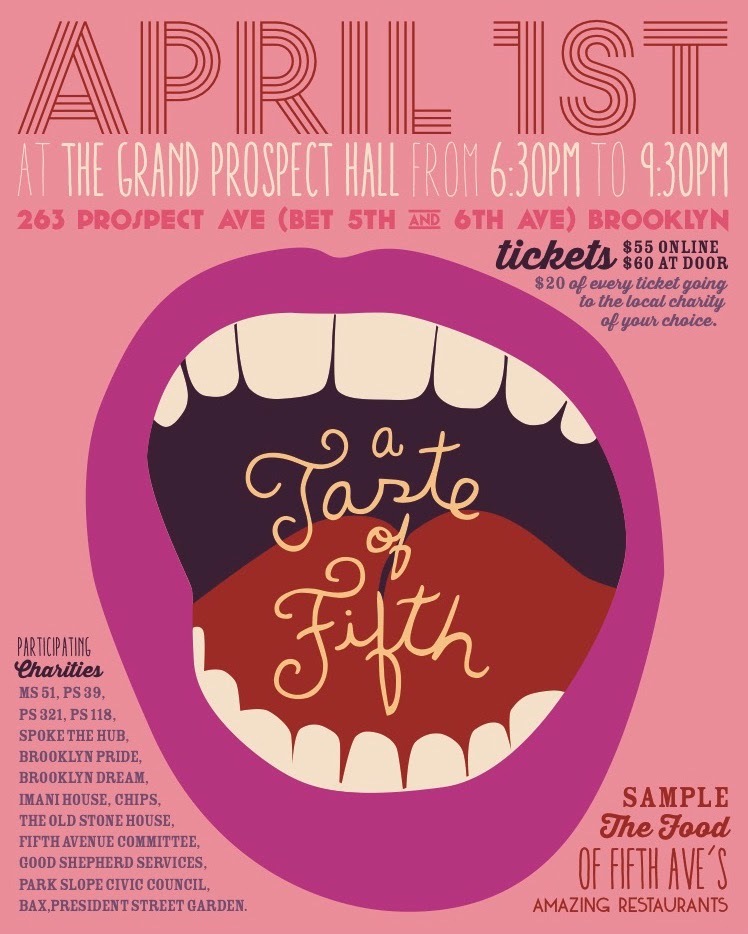Forty of Park Slope’s best bars and restaurants will once again set up shop tomorrow at Grand Prospect Hall for A Taste of Fifth, which benefits 15 neighborhood charities. Participating restaurants include Stone Park Café, Taco Santo, Luke’s Lobster, Bricolage, Grand Central Oyster Bar Brooklyn, Beygl, Jakes’s Handcrafted, Bogota Latin Bistro, Freddy’s Bar, M & S Prime Meats and The Chocolate Room. Wine and beer are included.